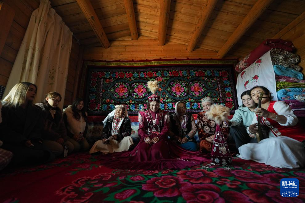 在特克斯县喀拉达拉镇加尔阔拉村,阿肯弹奏冬不拉,向新娘介绍男方亲友(10月11日摄)。