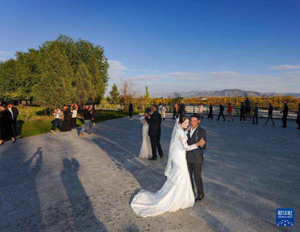 在特克斯河边的太极岛森林公园,新娘孔吐斯·也斯达吾列提与新郎布开汗·叶勒斯孜一起跳舞(10月11日摄)。