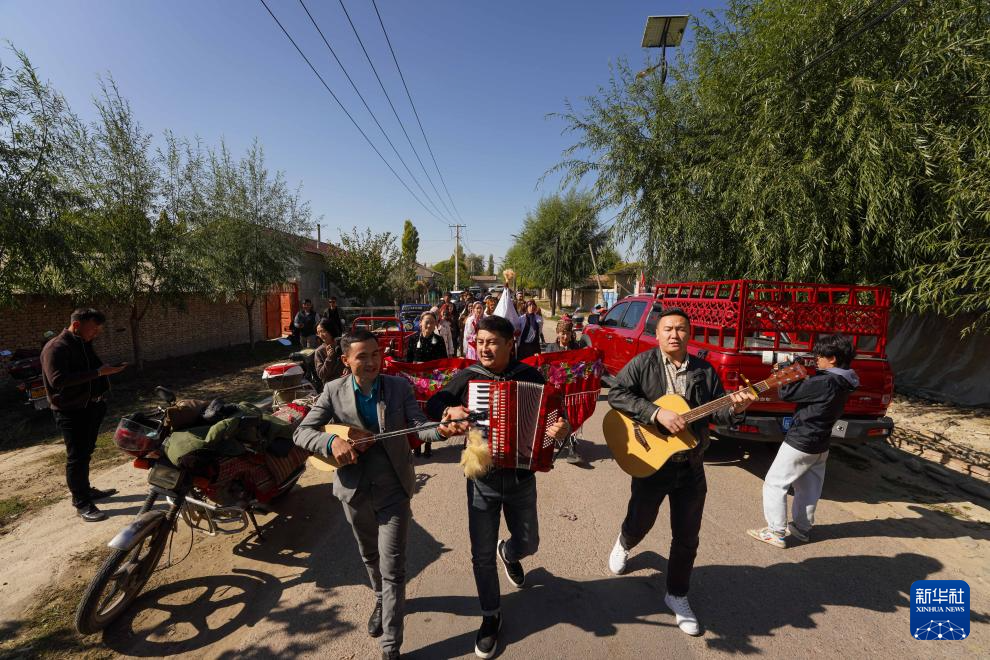 在特克斯县喀拉达拉镇加尔阔拉村,迎亲队伍向新郎家行进(10月11日摄)。