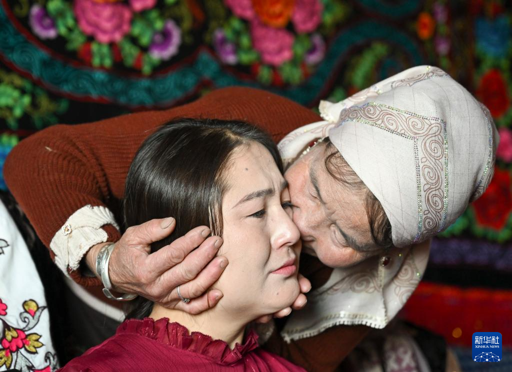 三伯母(右)亲吻孔吐斯·也斯达吾列提,送她出嫁(10月11日摄)。