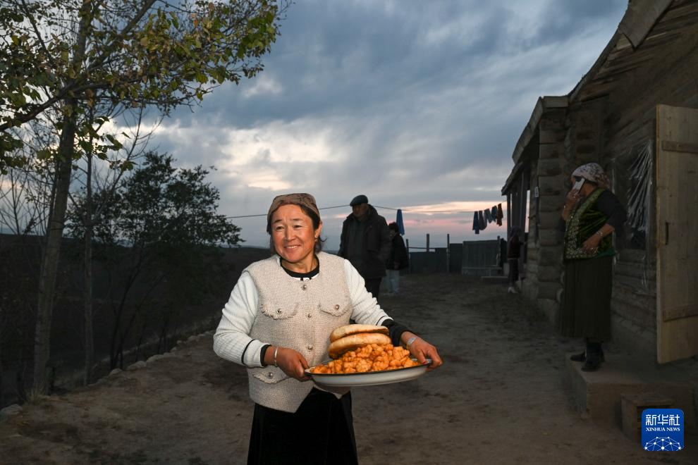 出嫁前一晚,孔吐斯·也斯达吾列提的母亲端着馕和包尔萨克走在家中小院,准备招待男方亲戚(10月10日摄)。