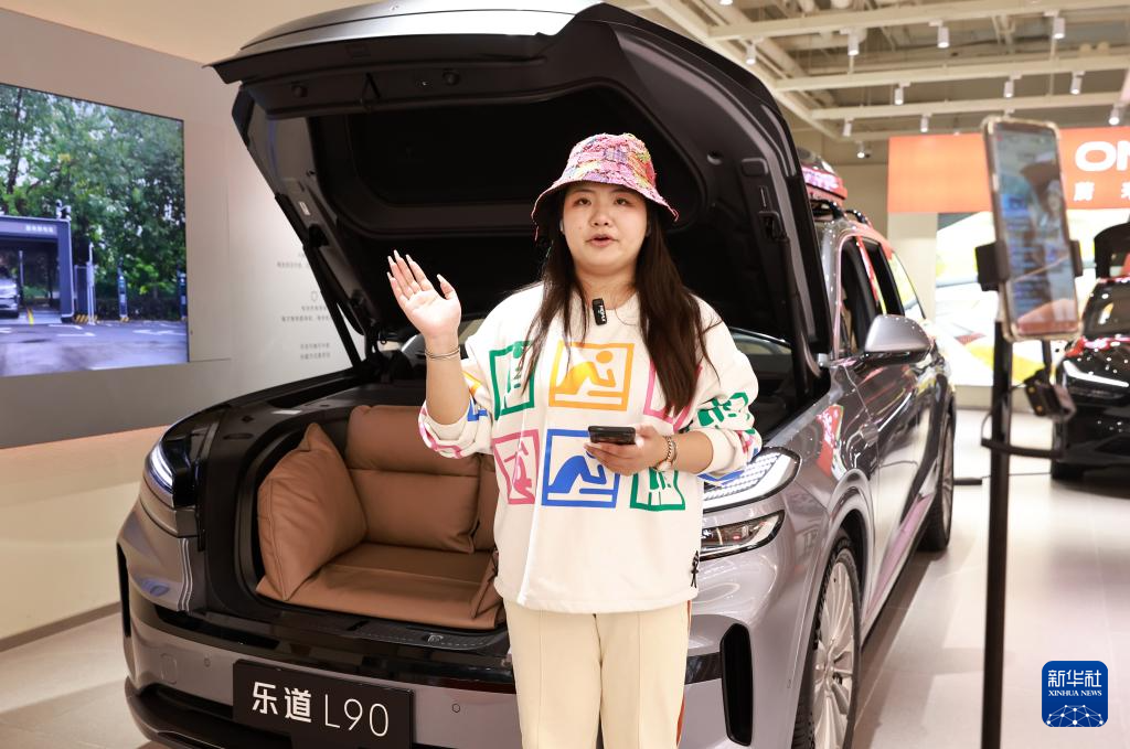 10月14日,在湖北省武汉市武昌区一家商场,主播为网友介绍新能源汽车性能。