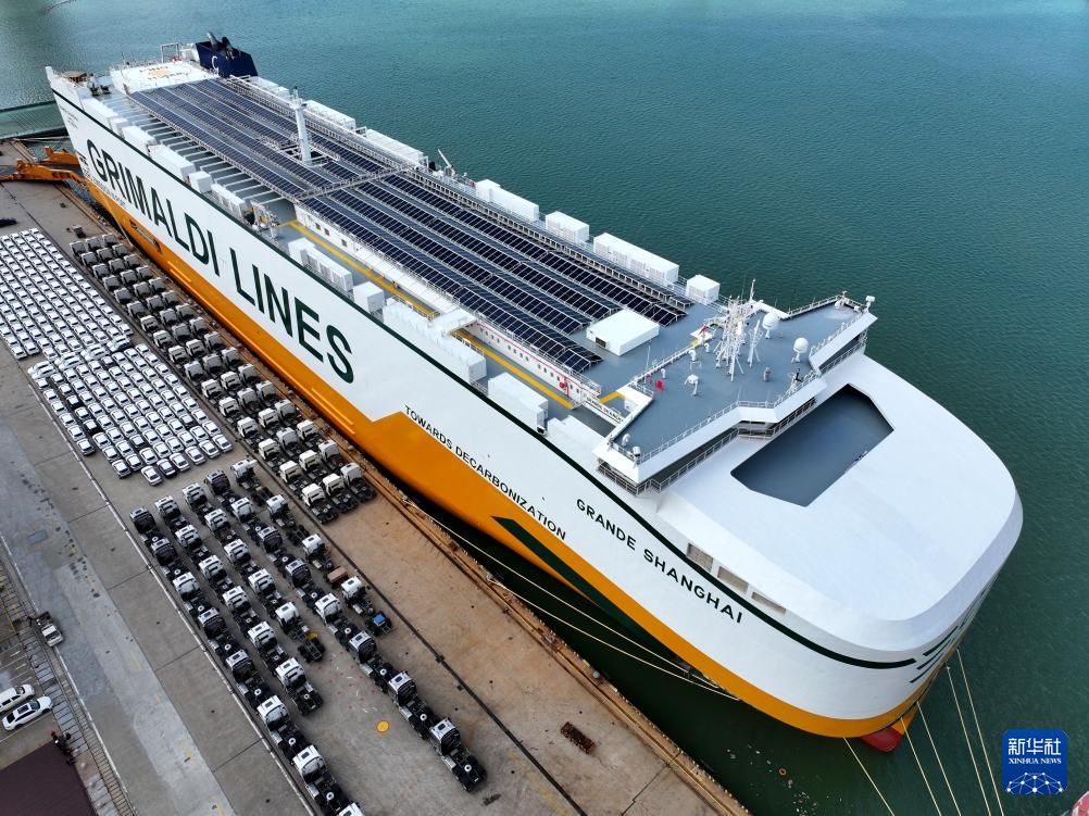10月14日,在江苏省连云港港东方港务分公司码头,滚装轮装载汽车准备外运(无人机照片)。