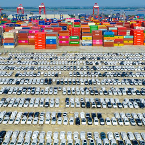 10月4日在江苏省港口集团南京港龙潭港区拍摄的准备装船出口的汽车(无人机照片)。