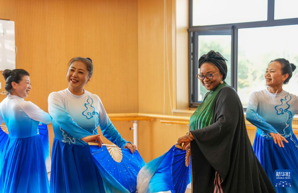 10月14日,嘉宾在北京市顺义区妇女儿童社会服务中心与舞蹈爱好者跳舞。