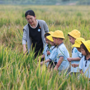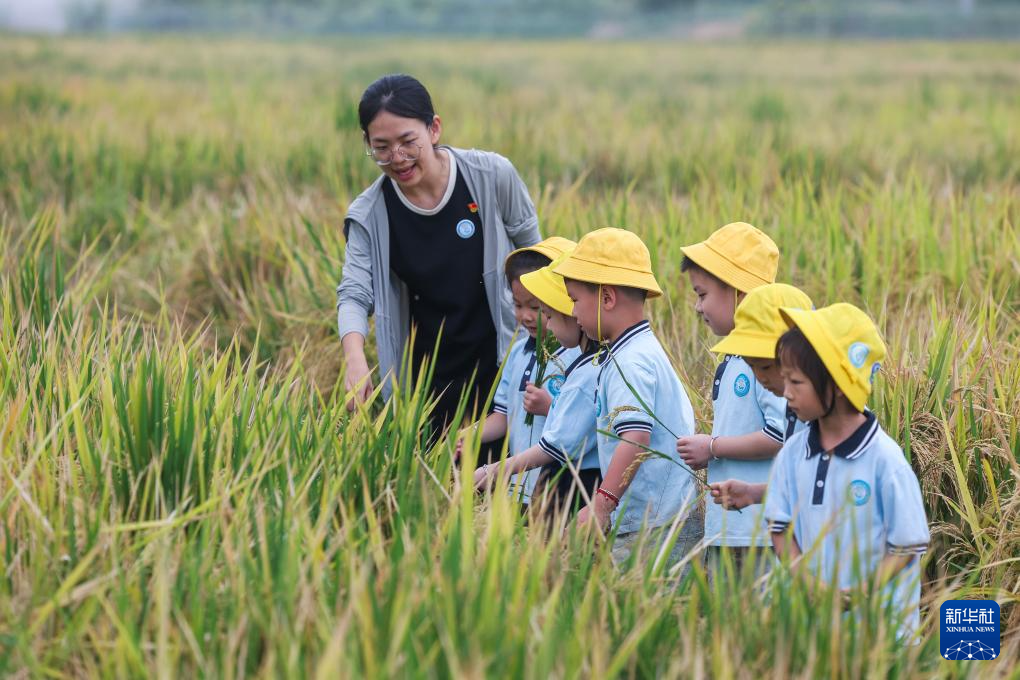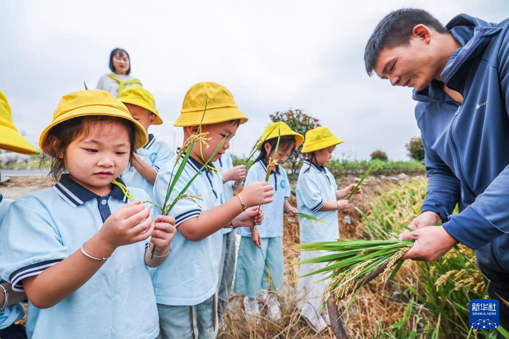 10月14日,在浙江省湖州市吴兴区东林镇保永村的稻田里,东林镇中心幼儿园的孩子们在种粮大户的带领下近距离观察稻穗,体验收割。