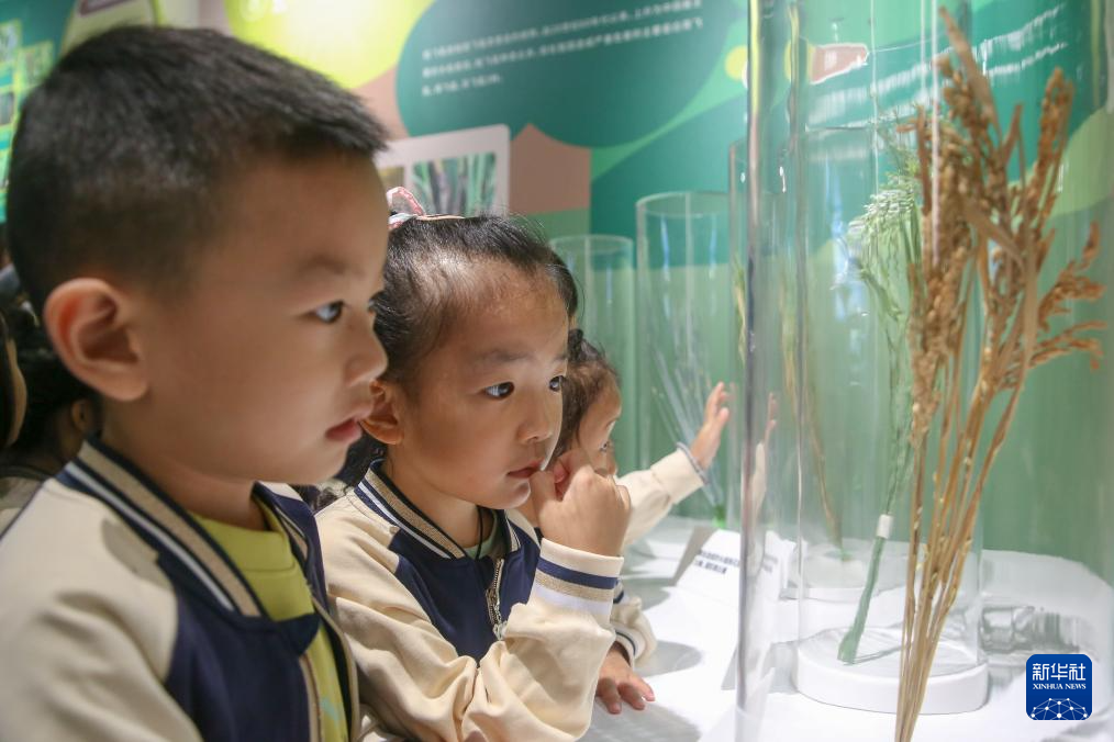 10月14日,湖南省衡阳市衡阳县合顺幼儿园小朋友在角山欢乐大米馆观察水稻。
