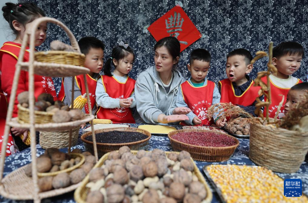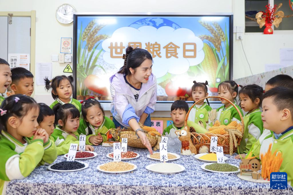 10月14日,浙江省湖州市吴兴区东林镇中心幼儿园的老师带着孩子们开展世界粮食日主题课程,了解各类粮食知识。