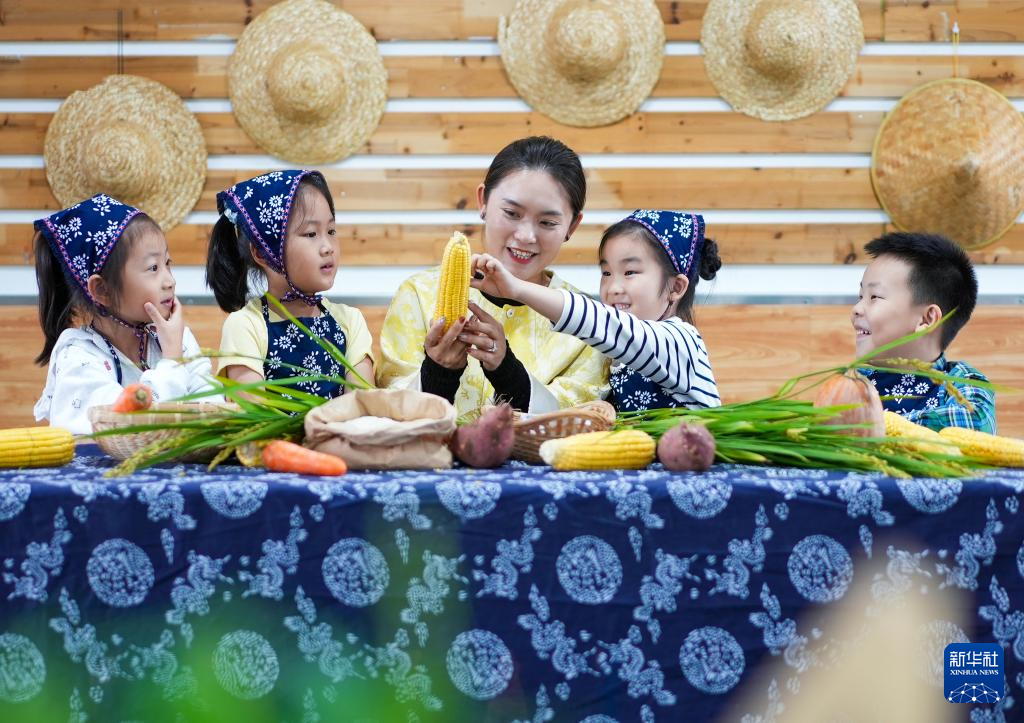 10月14日,在天津市滨海新区可爱蜗幼儿园,志愿者指导孩子们认识粮食作物。