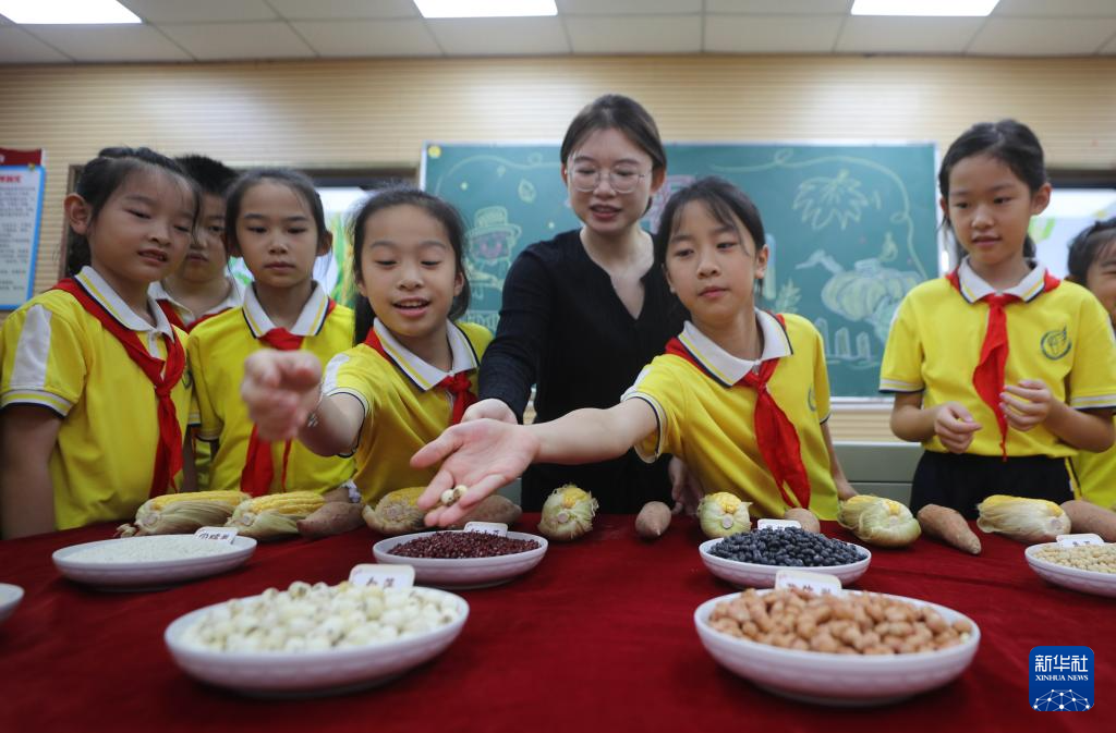 10月14日,江苏省泰州市姜堰区实验小学教育集团城南校区的老师带领学生辨识粮食。
