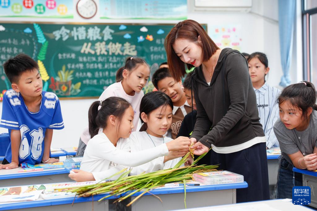 10月14日,在江苏省海安市南屏小学,老师给学生介绍水稻相关知识。