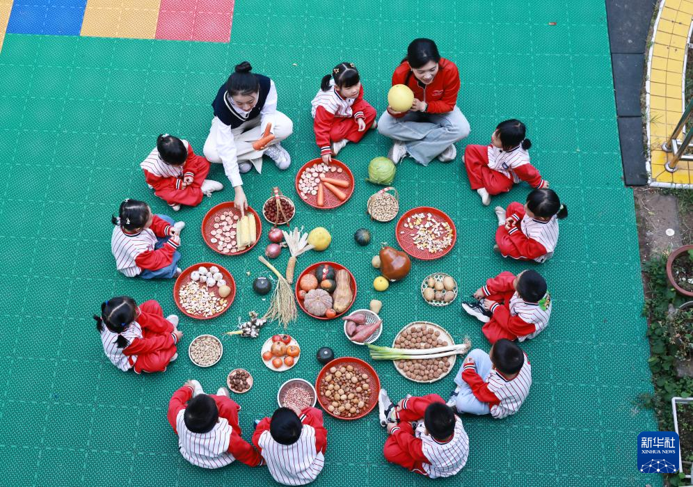 10月14日,武汉市洪山区实验幼儿园小朋友在老师指导下学习辨识粮食。