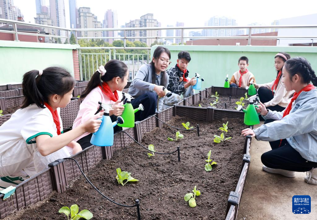 10月14日,武汉市洪山区未来实验小学学生在老师指导下浇灌作物。