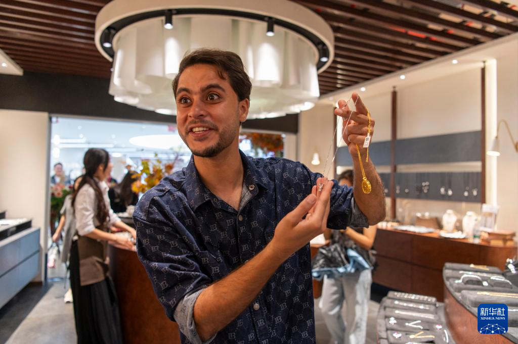 10月14日,外籍客商在义乌全球数贸中心选购珠宝饰品。