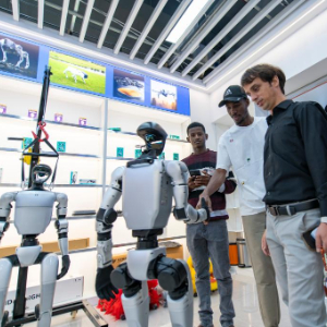 10月14日,外籍客商在义乌全球数贸中心与机器人互动。