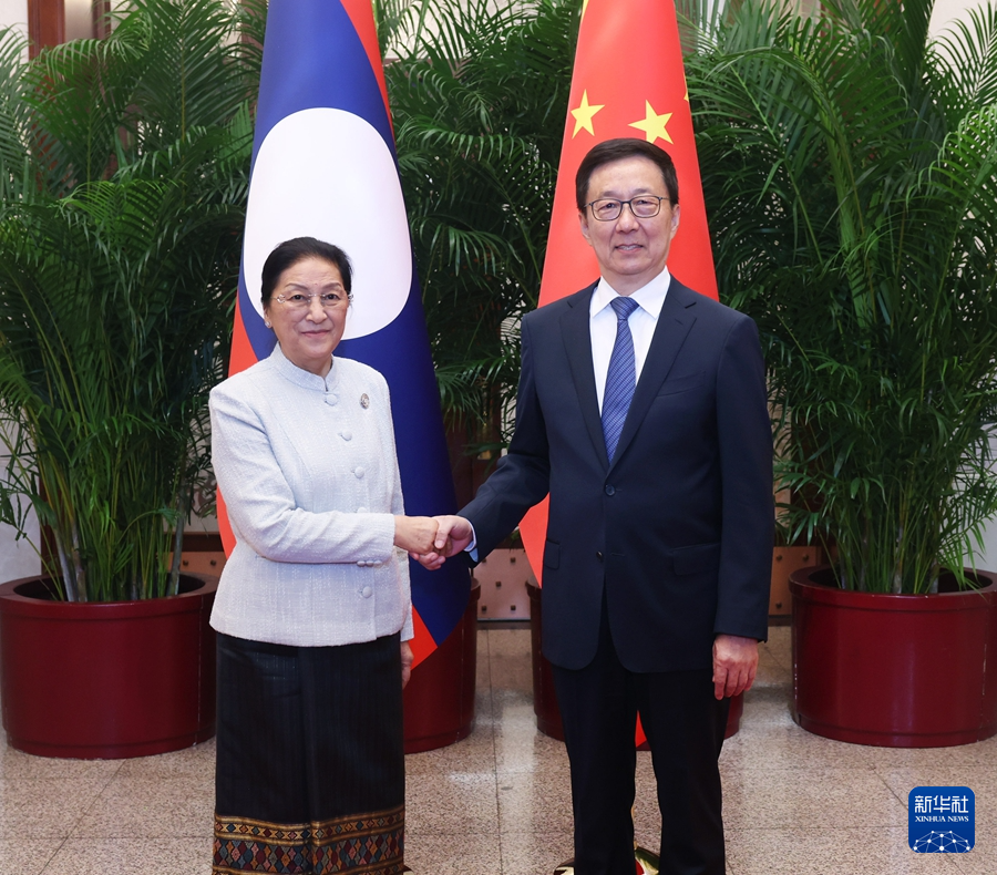 10月14日,国家副主席韩正在北京会见来华出席全球妇女峰会的老挝国家副主席巴妮。