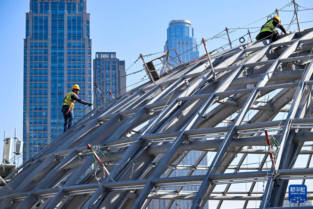 10月14日,工作人员在天津劝业场大楼顶部施工。