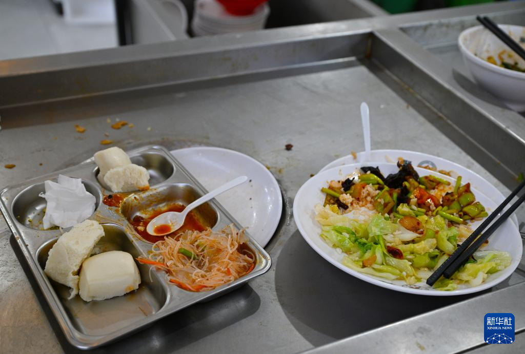 10月14日,在河南郑州某大学食堂收餐台上,餐盘里有不少剩饭剩菜。