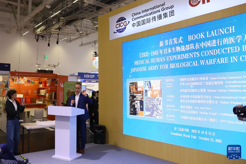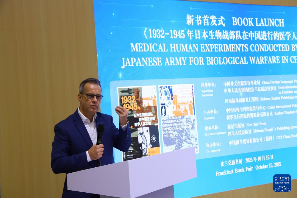 10月15日,在德国法兰克福书展举行的《1932-1945年日本生物战部队在中国进行的医学人体实验》(中英文版)首发式上,作者蒂尔·贝尔尼希豪森致辞。