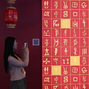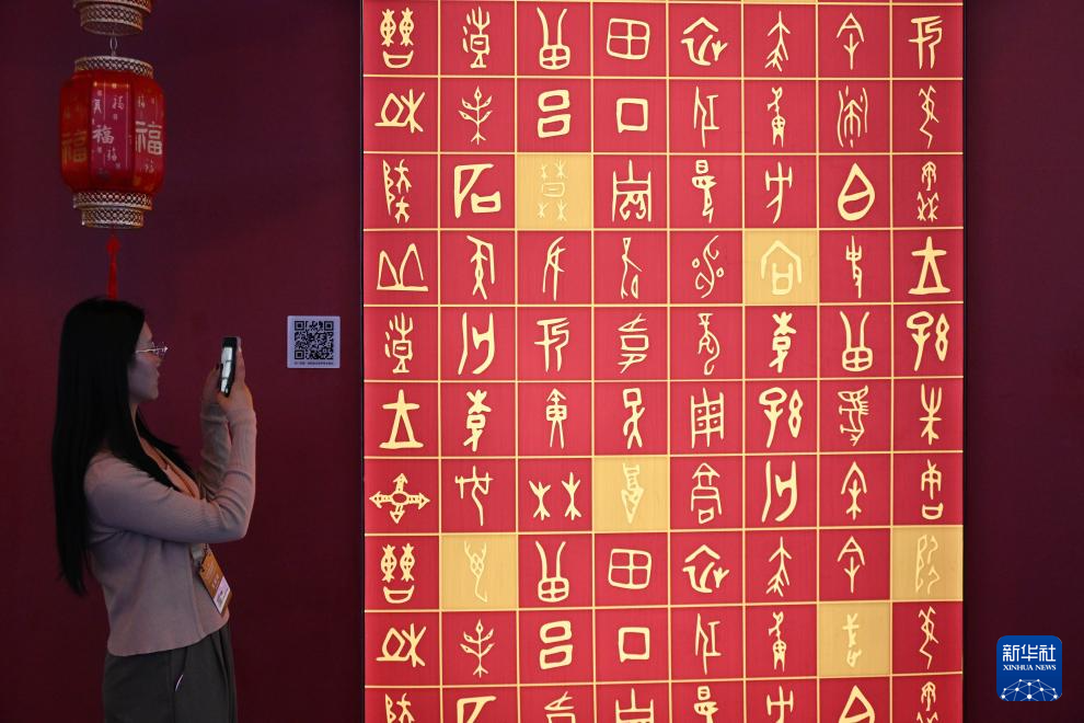 10月16日,与会人员在第十届中国国际版权博览会上拍摄“甲骨文百家姓”。