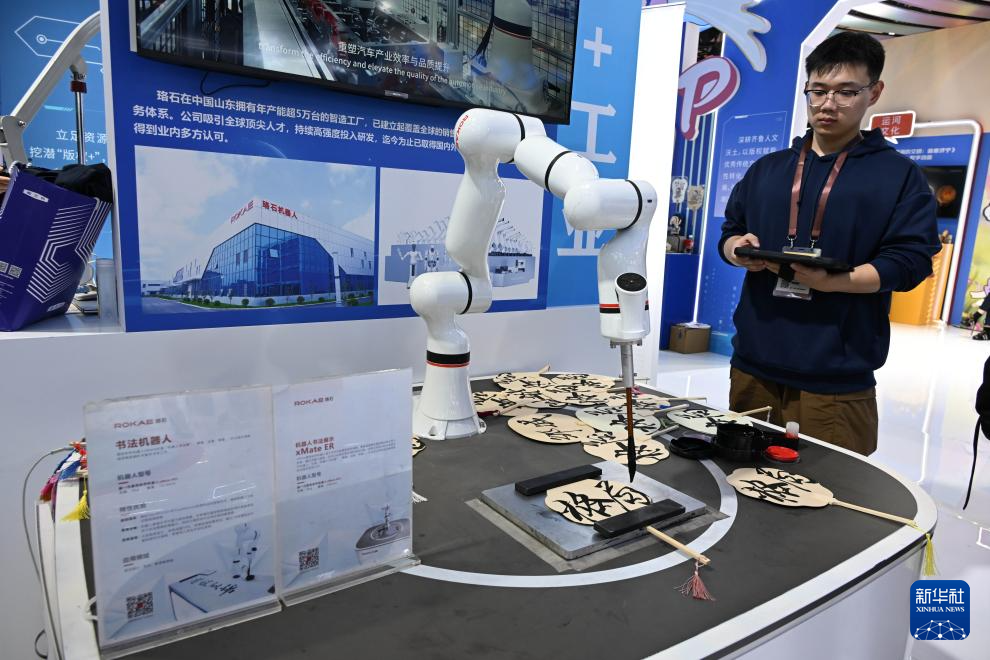 10月16日,与会人员在第十届中国国际版权博览会上操控书法机器人。
