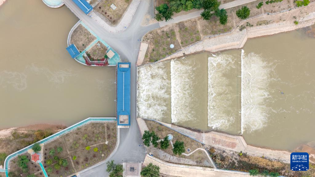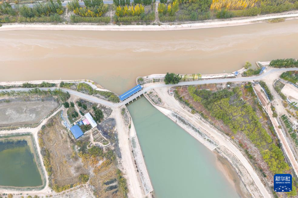 10月16日,用于灌溉的黄河水流经内蒙古巴彦淖尔市临河区境内的总干渠第二分水枢纽(无人机照片)。