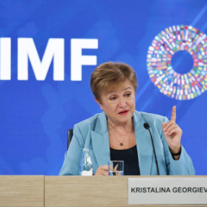 10月16日,在美国华盛顿,国际货币基金组织(IMF)总裁格奥尔基耶娃在新闻发布会上讲话。