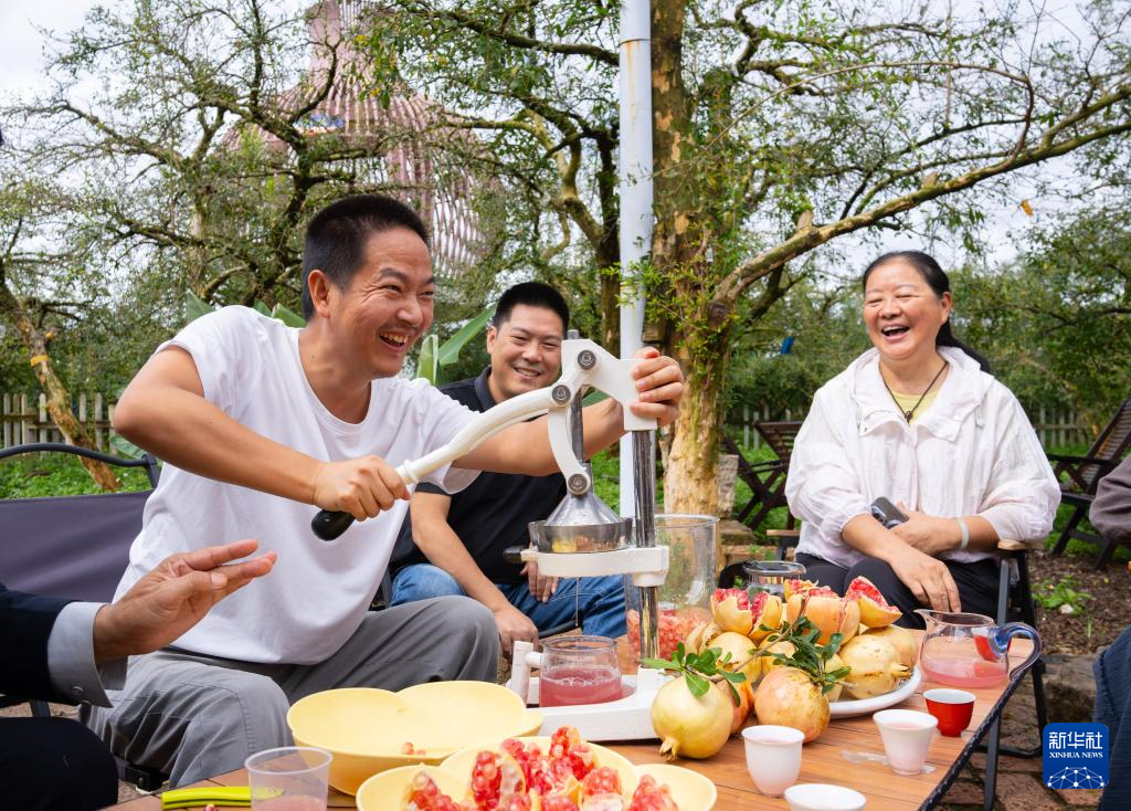 10月16日,游客在蒙自百年古树石榴园品尝榨石榴汁。