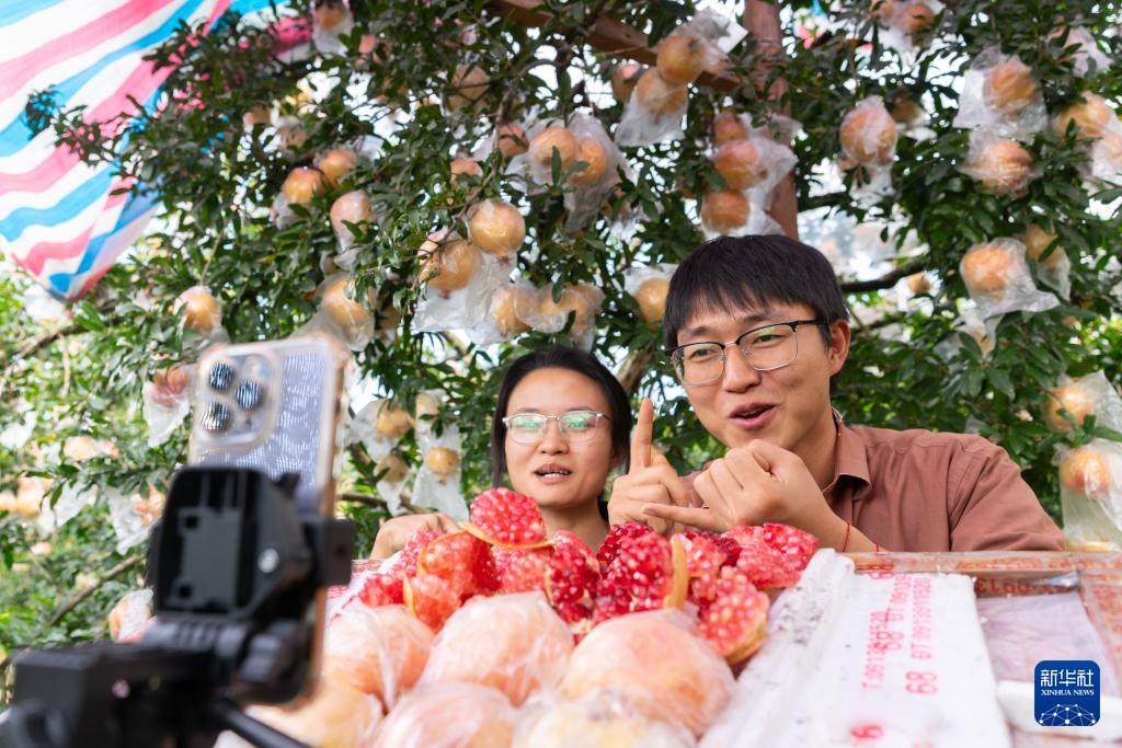 10月15日,返乡创业大学生吴海涛(右)和李敏在果园直播推介蒙自石榴。