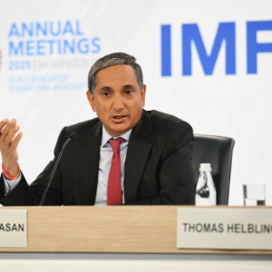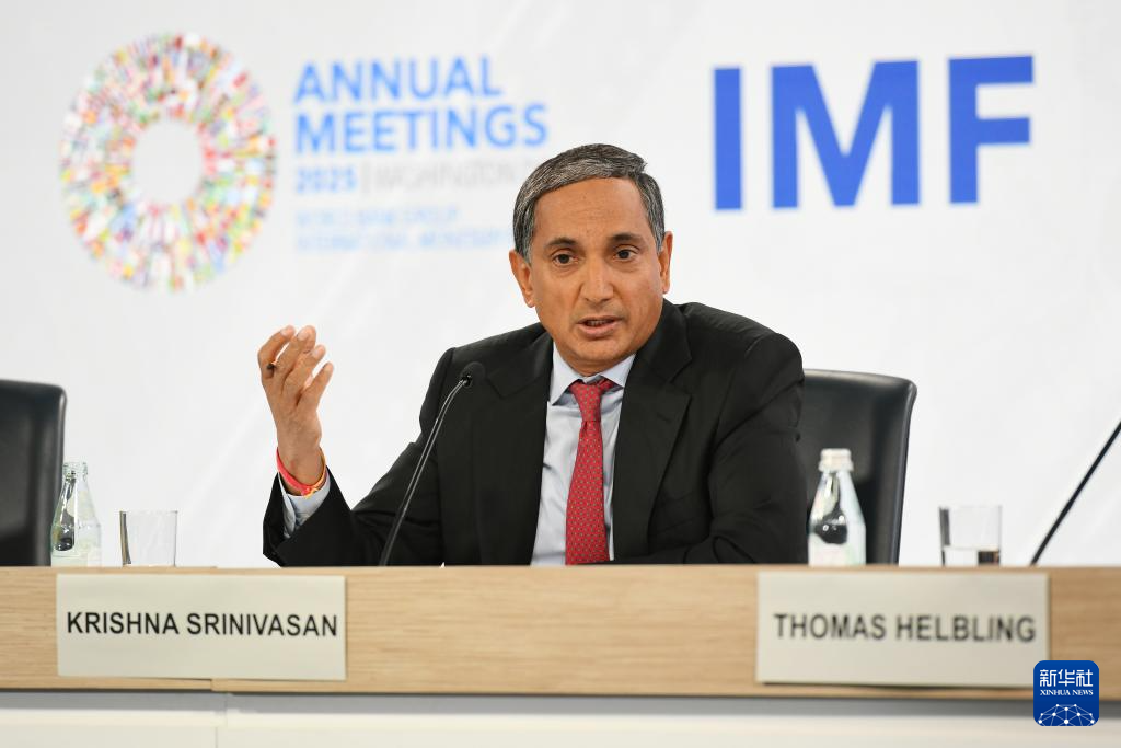 10月16日,在美国华盛顿,国际货币基金组织(IMF)亚太部主任斯里尼瓦桑(中)在新闻发布会上讲话。