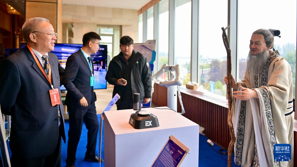 10月17日,一名参会嘉宾在沈阳新次元人形机器人研究院有限公司展台与交互型仿生人形机器人“孔子”互动。