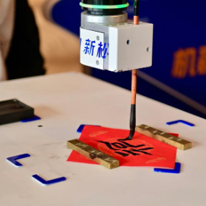 10月17日,在沈阳新松机器人自动化股份有限公司展台,智能机器人用毛笔写福字。