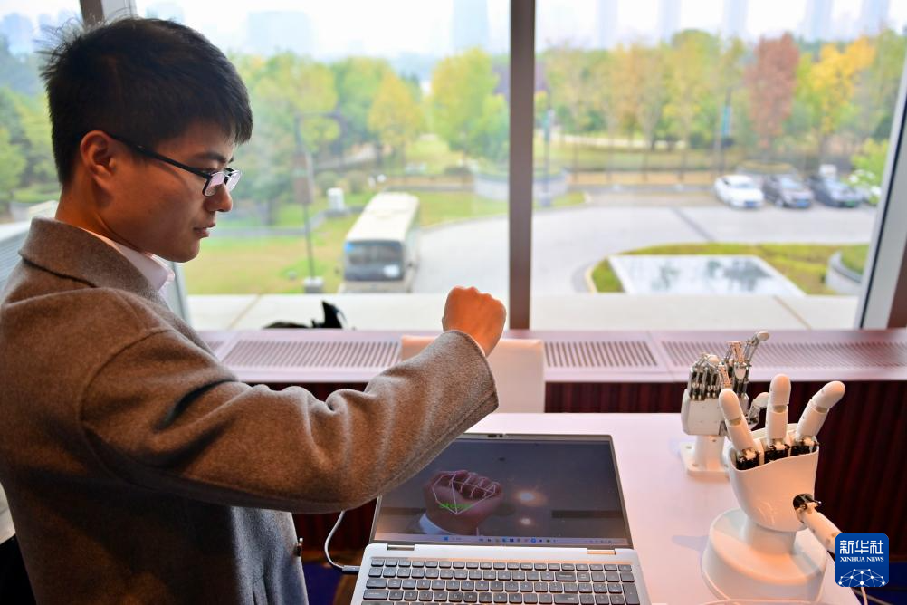 10月17日,在中国科学院沈阳自动化研究所展台,工作人员演示“仿生五指灵巧手”展品。