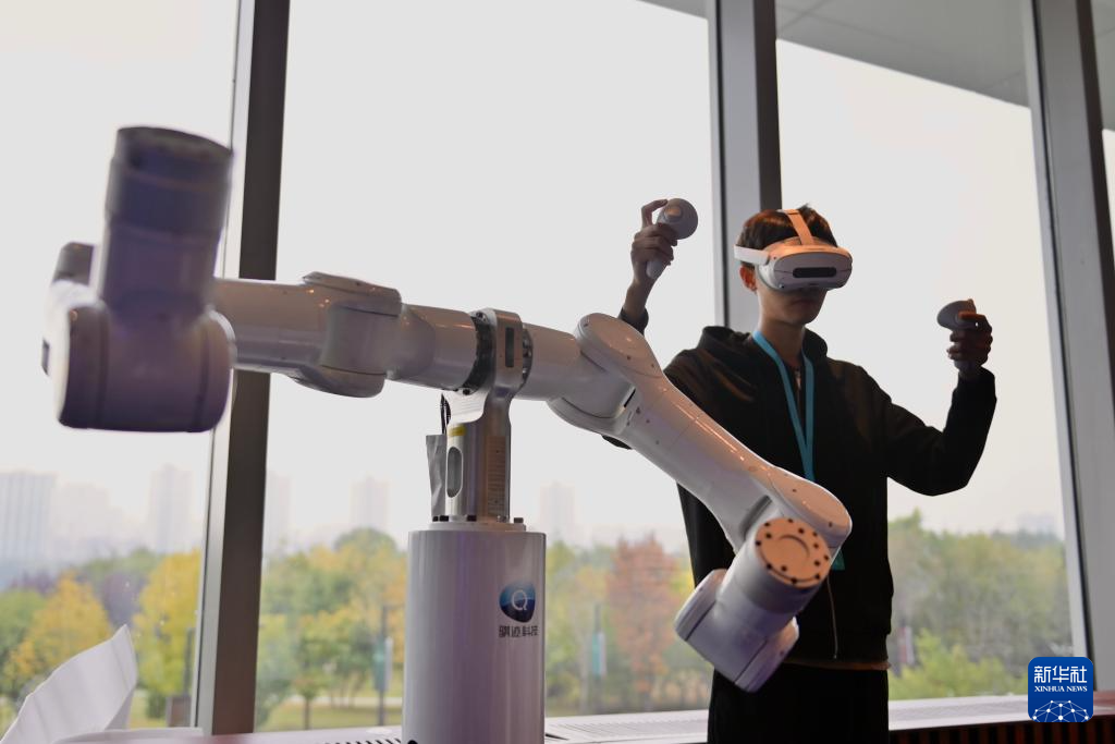 10月17日,在广东天机智能系统有限公司展台,工作人员演示“全力控高精度人形臂Marvin”展品。