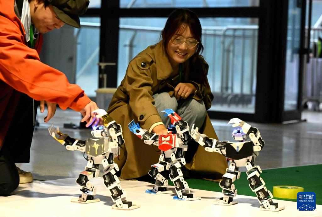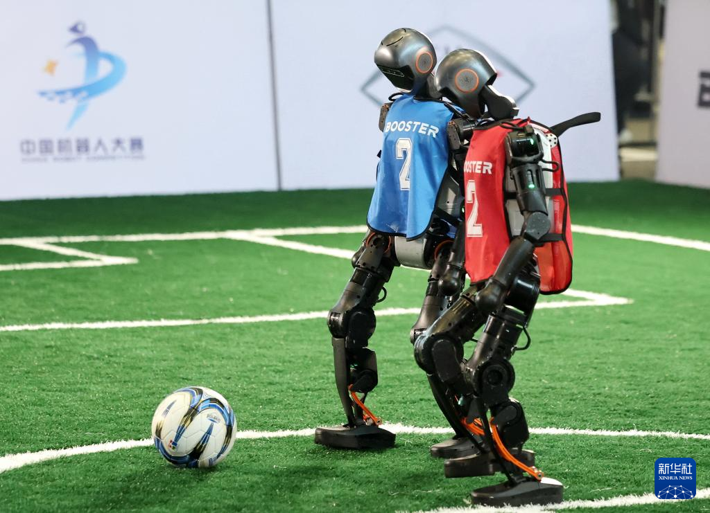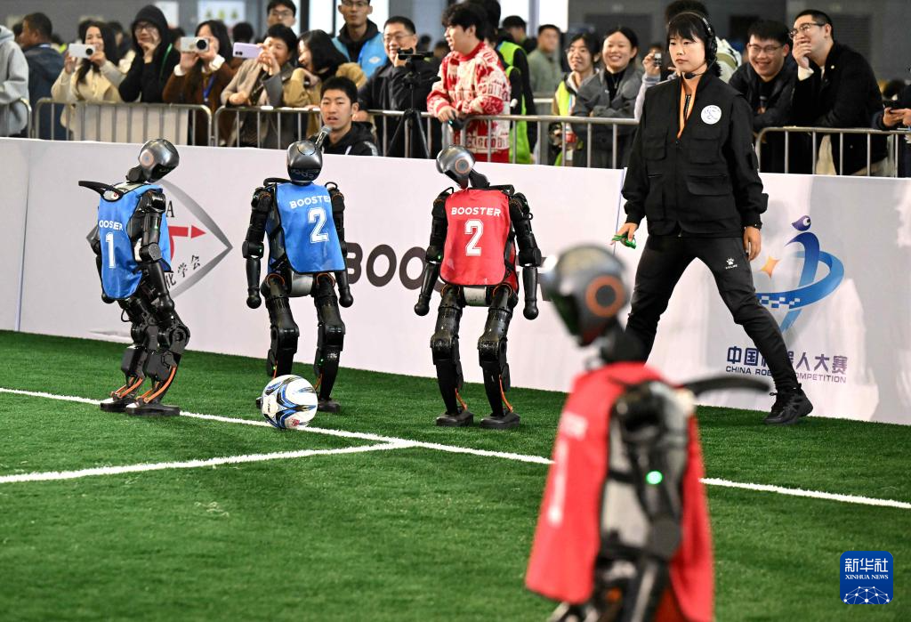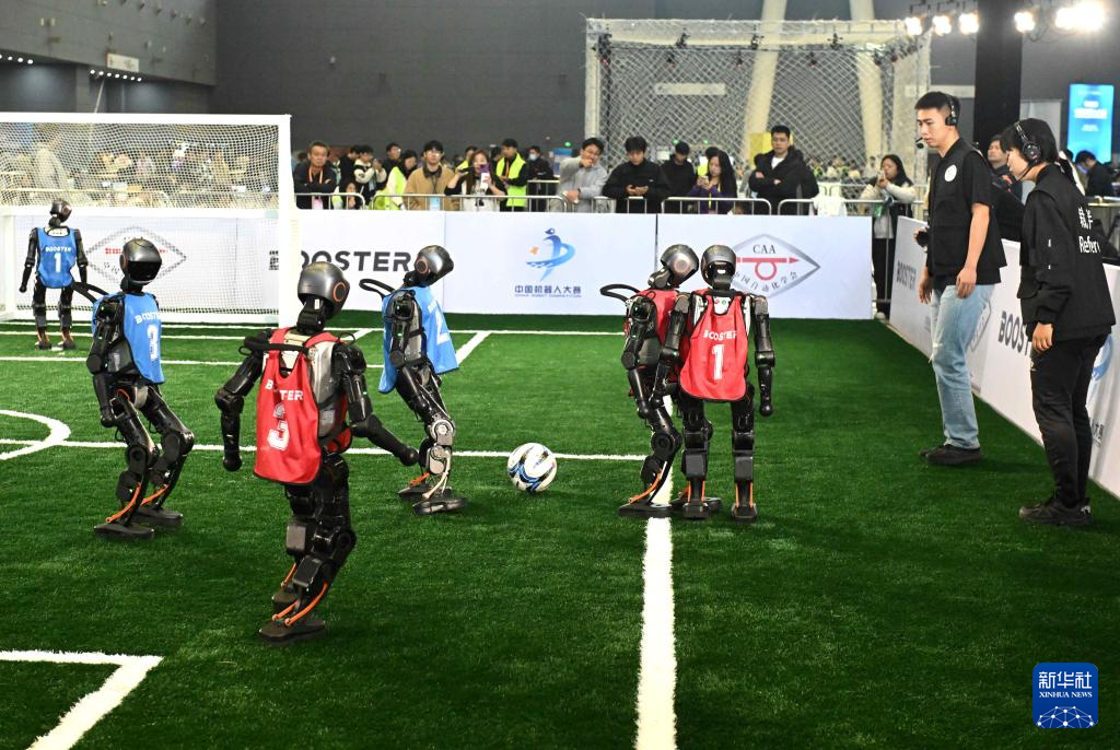 10月17日,机器人在河北省石家庄国际会展中心进行足球比赛。