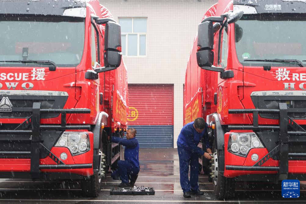 10月17日,黑龙江省森林消防总队哈尔滨市支队特勤大队消防员在雪中巡查检修救援车辆,做好应急救援准备。