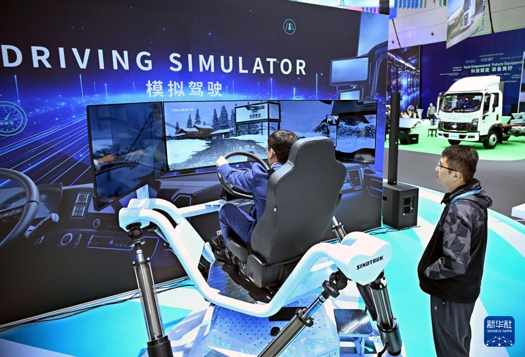 10月18日,与会人员在大会室内展区体验卡车模拟驾驶。