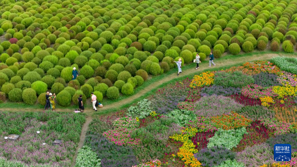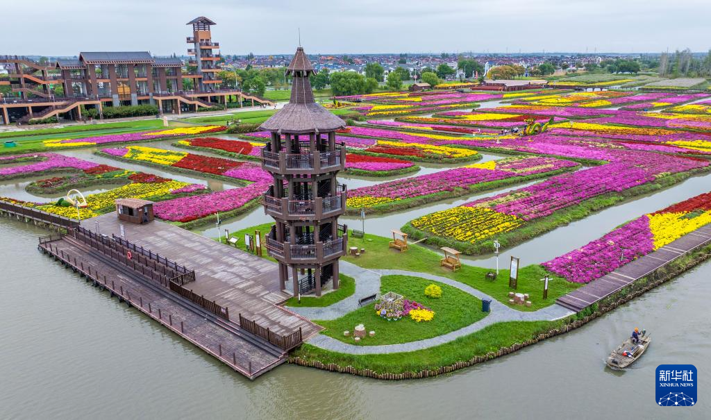 10月17日,游客在江苏省昆山市开发区慧聚花海赏花游玩(无人机照片)。