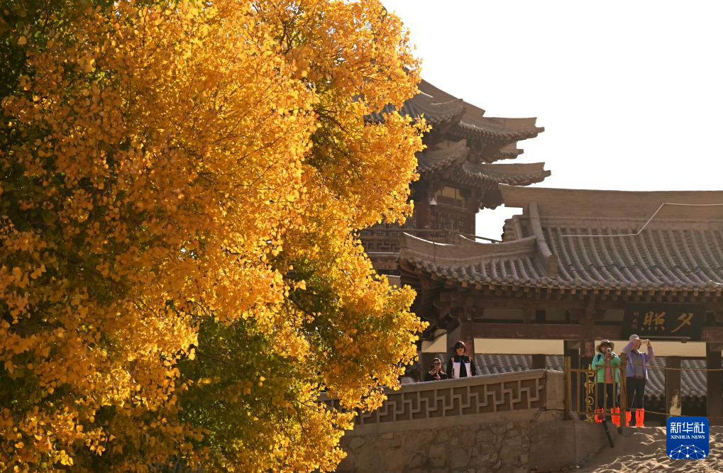 10月18日,游客在甘肃省敦煌市鸣沙山月牙泉景区的胡杨前拍照。