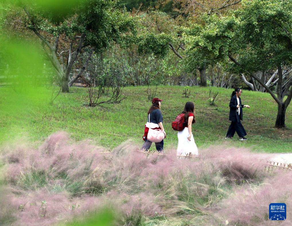 10月17日,游客在山东省烟台市黄渤海新区海螺广场粉黛花海游玩。