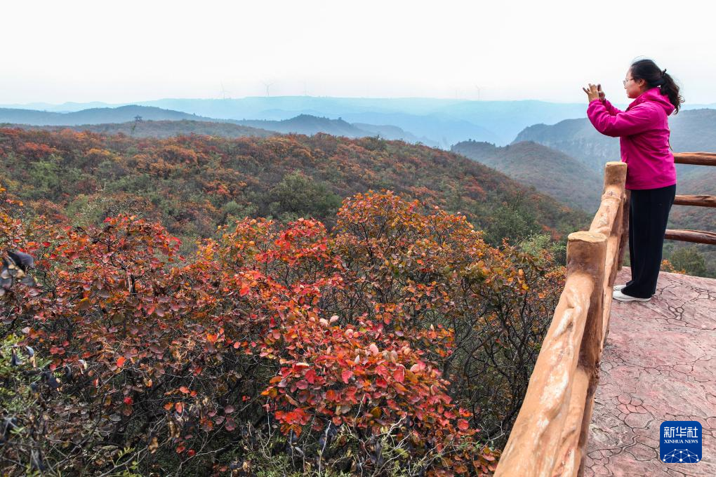 10月16日,在河南省焦作市博爱县青天河景区靳家岭上,游客在拍摄红叶美景。