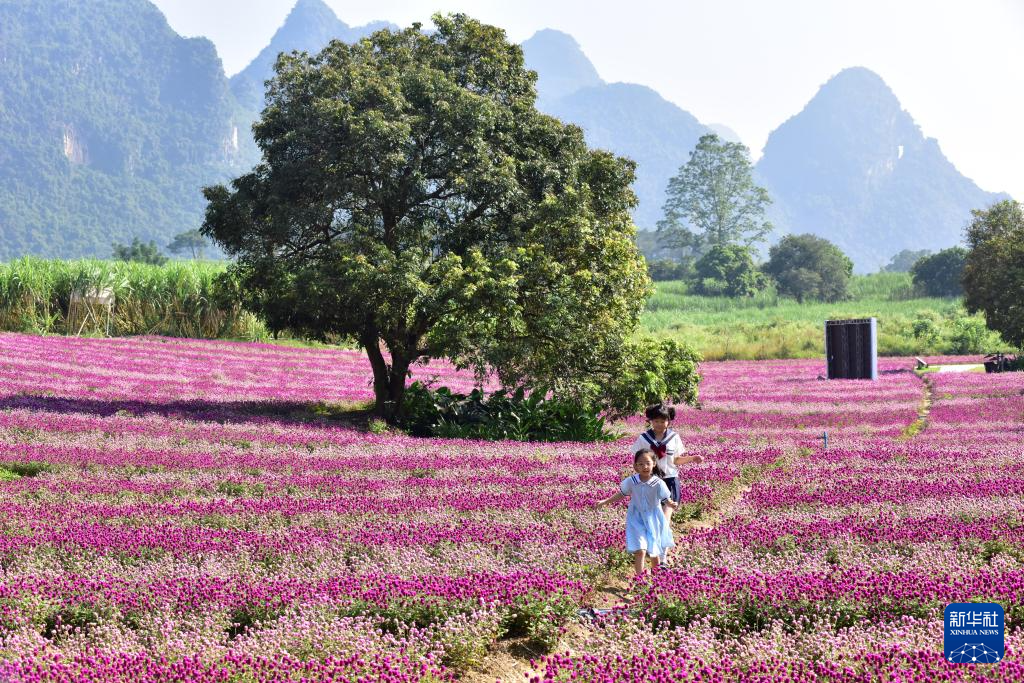 10月18日,小朋友在广西崇左市大新县峒那屿湾景区赏花游玩。