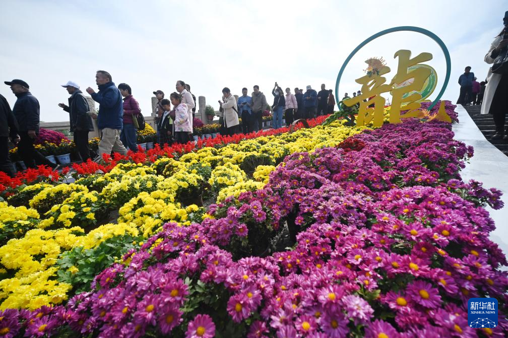 10月18日,游客在河南省开封市龙亭公园内观赏菊花。