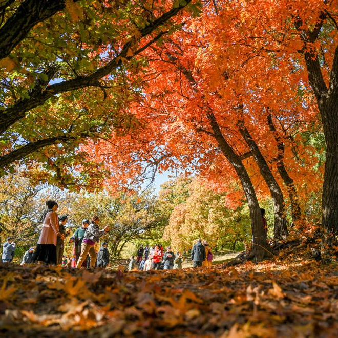10月18日,游人在乌旦塔拉五角枫森林公园游览。