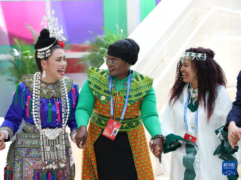 10月14日,在全球妇女峰会配套活动“数智赋能妇女和女童成果展”,来自坦桑尼亚和埃塞俄比亚的嘉宾与侗族大歌表演者们一起载歌载舞。