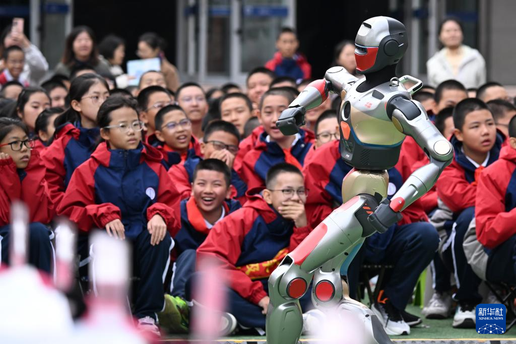 10月13日,新疆生产建设兵团第一中学学生在科技节开幕式上观看智能机器人跳舞。