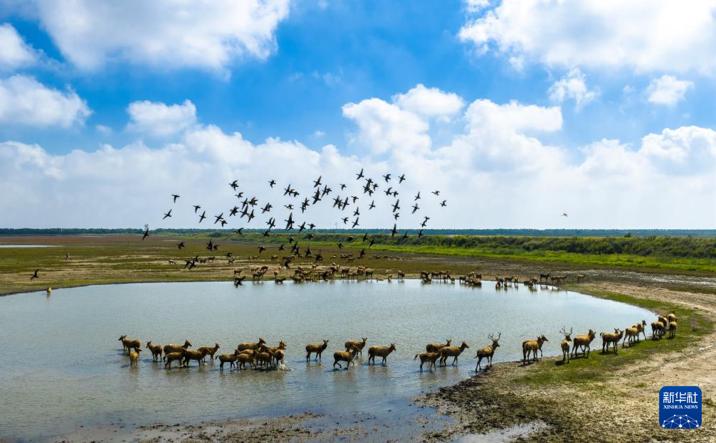 10月11日,在江苏东台条子泥湿地,候鸟飞翔,成群野生麋鹿悠闲散步,一派人与自然和谐共生的生态美景(无人机照片)。
