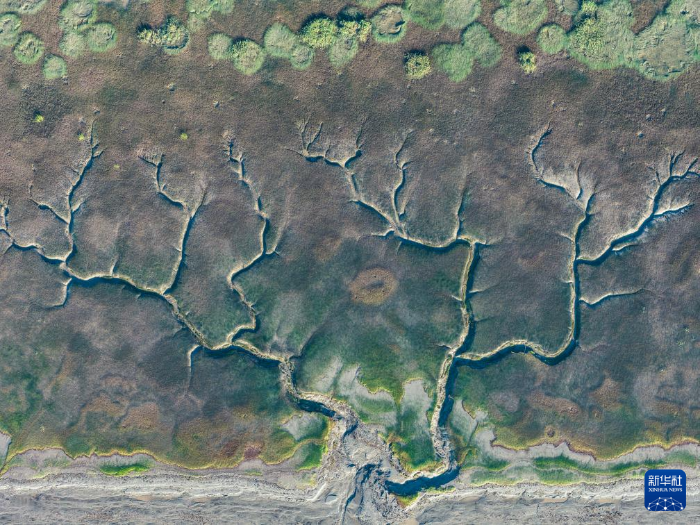 10月11日在浙江嘉兴海宁拍摄的钱塘江退潮后的“潮汐树”(无人机照片)。