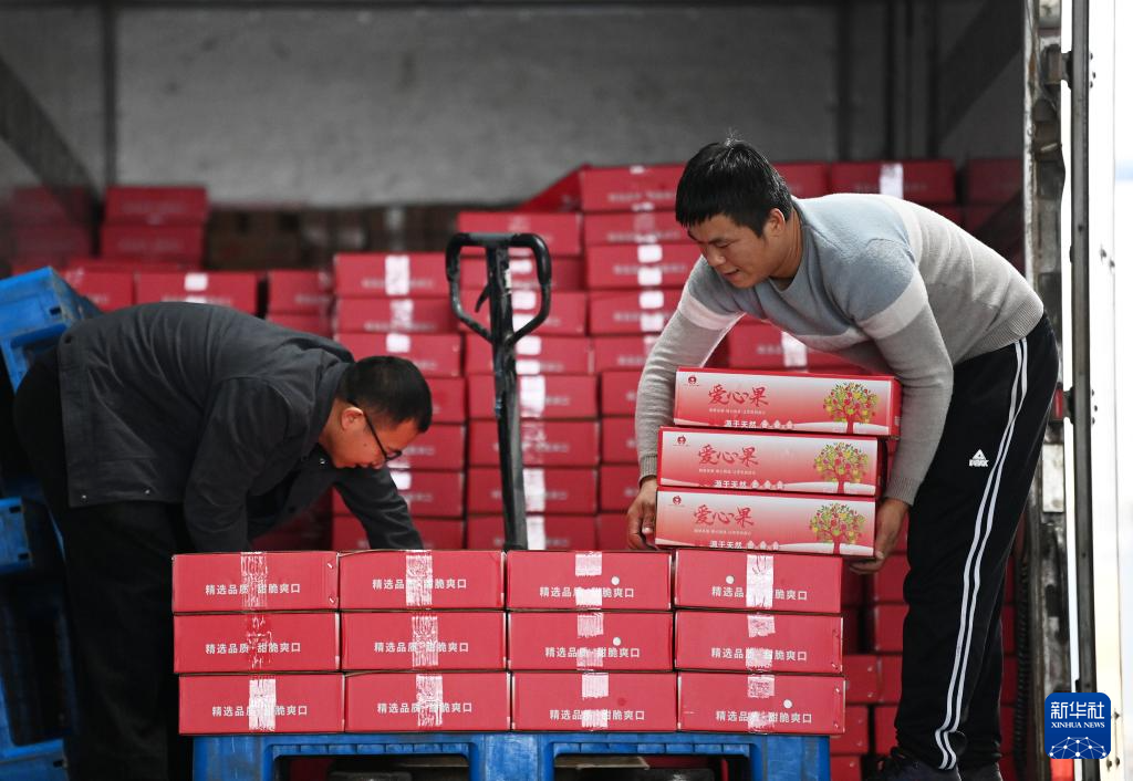 10月18日,在渭南市白水县盛隆果业,工人将苹果装车。