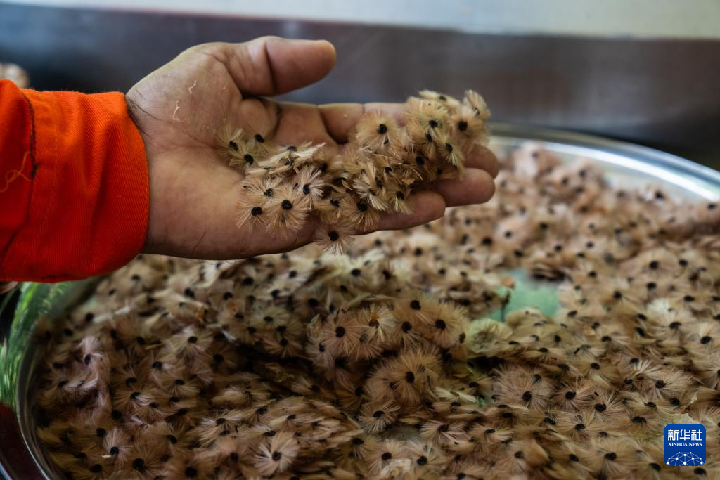 10月17日,在巴西亚马孙州的乌鲁库油气生产基地,一名工作人员查看用于培育热带雨林植物的种子。